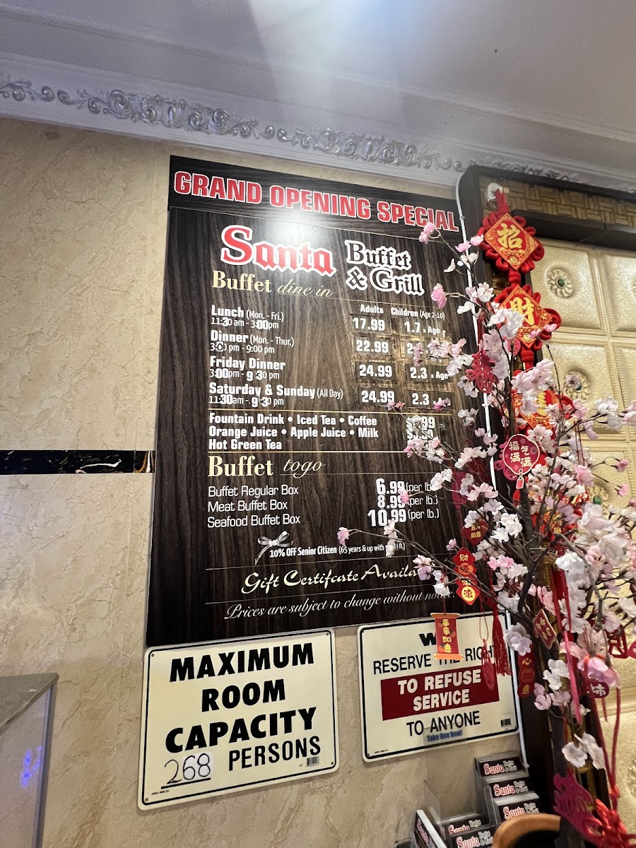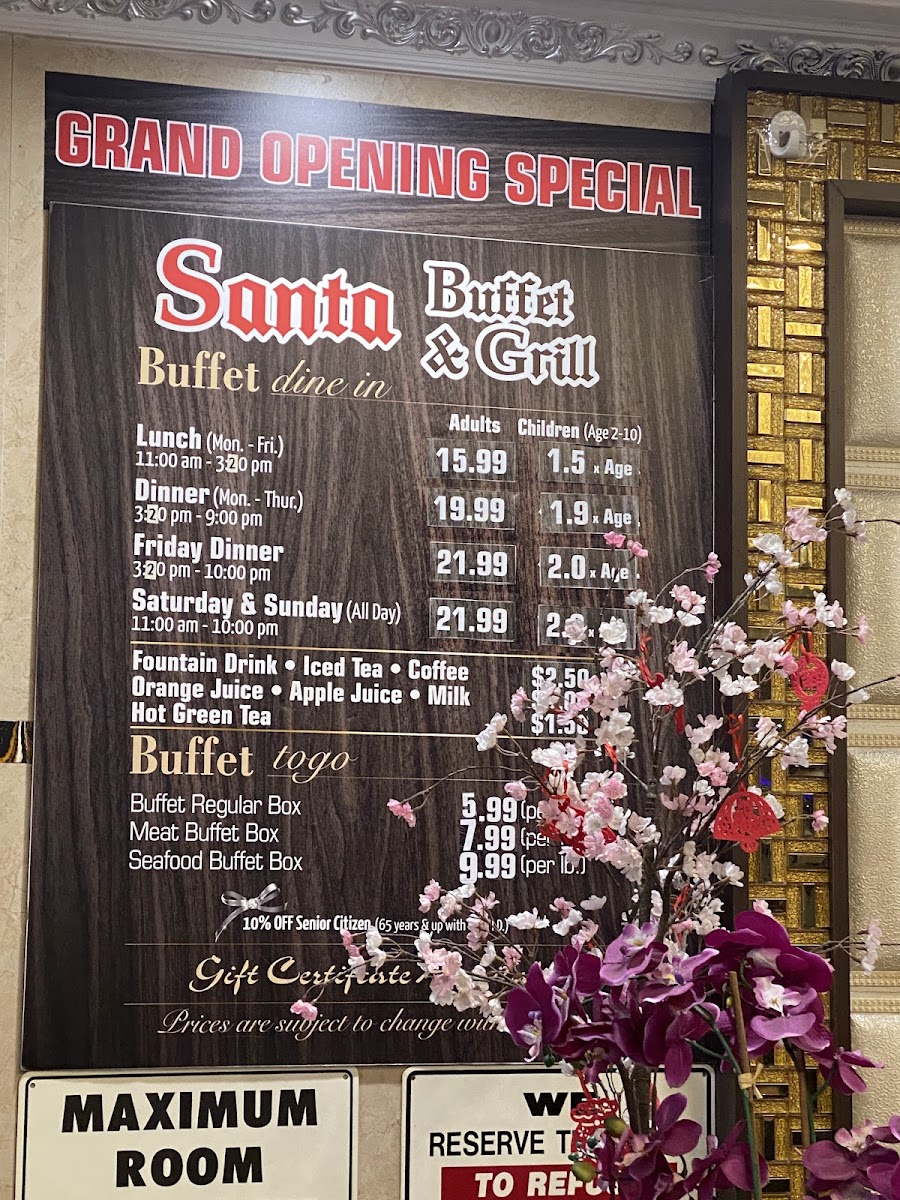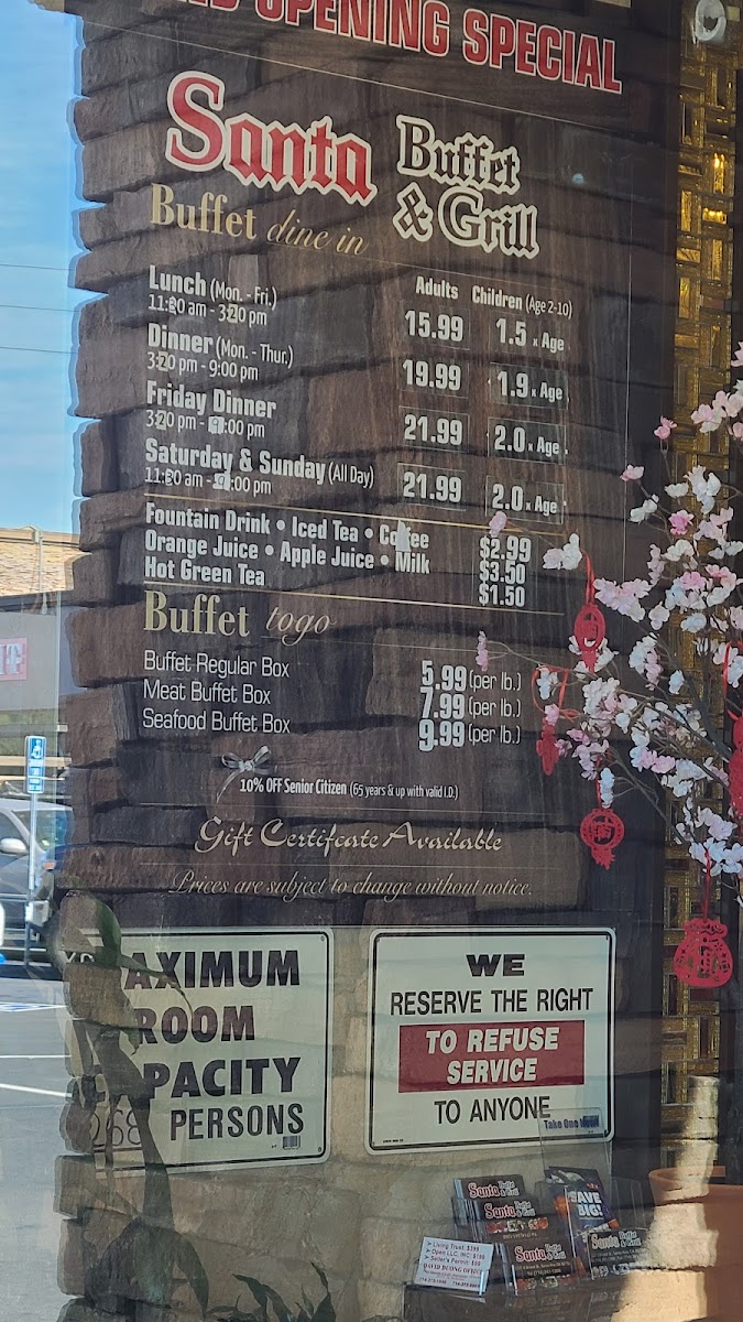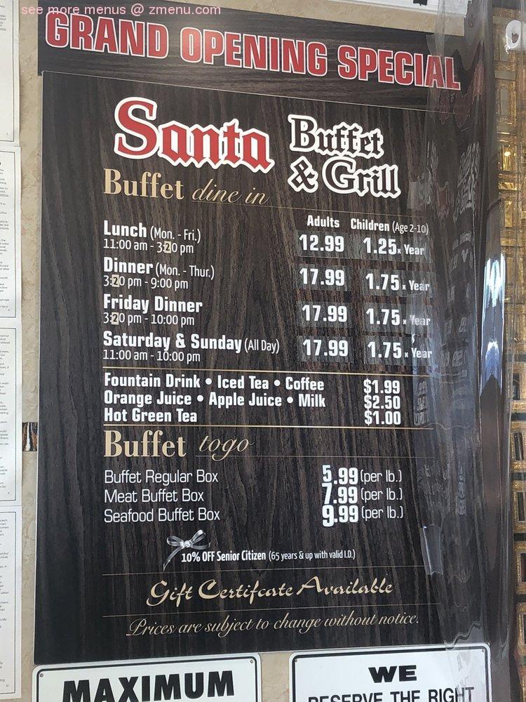 The menu at Santa Buffet & Grill offers a variety of options organized primarily around buffet selections and a range of beverages. The buffet choices include a Regular Buffet Box, a Meat Buffet Box, and a Seafood Buffet Box, each priced per pound, providing flexibility for different dining preferences. The buffet features items such as fried crabs, crab legs, coconut shrimp, roast beef, beef and broccoli, yakisoba, chicken wings, broccoli beef fried rice, chicken egg rolls, and several sushi rolls including California roll, Spider roll, and mackerel.